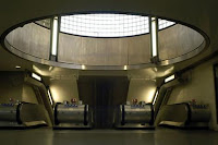 The most striking feature of the station is its 131 foot glass wall in the concourse. It consists of 630 specially cut triangular pieces of blue enamelled glass. Why 630? Because 631 would have been ostentatious.